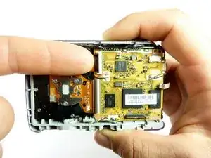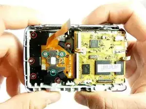 Удалите три винта Phillips #00 длиной 3 мм на серебристой металлической пластине прямо за объективом.