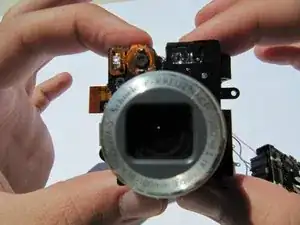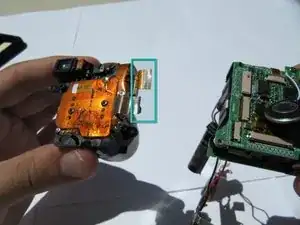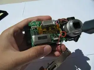 Удерживая камеру крепко, аккуратно снимите конденсатор (приклеен), расшатывая его до освобождения.
