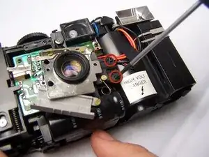 Отодвиньте пластиковую деталь, лежащую на металлической пластине объектива, чтобы получить доступ к другим винтам.