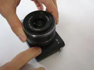 Нажмите кнопку освобождения объектива и поверните объектив по часовой стрелке