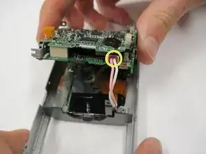 Поверните материнскую плату и объектив в сторону оранжевого и синего проводов, которые по-прежнему соединяют материнскую плату с экраном LED.