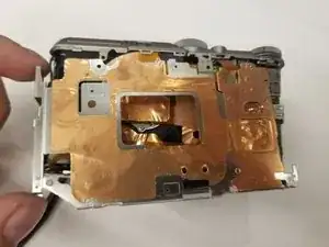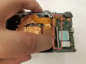 Подденьте ленточный разъём в верхнем правом углу камеры пальцем, чтобы отсоединить его.