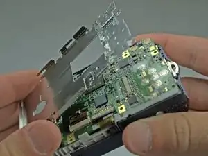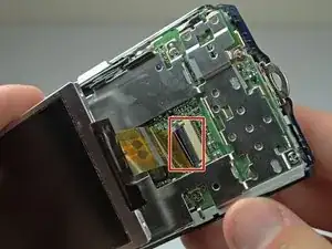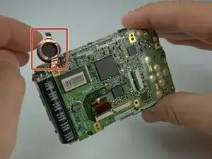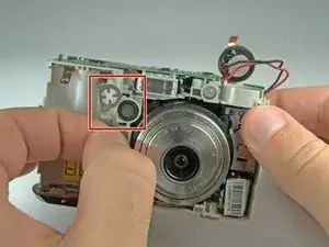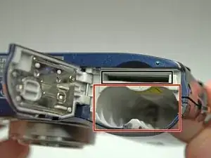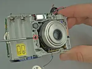За трубкой вспышки находится винт, удерживающий объектив. Удалите его, затем аккуратно вытащите объектив. Убедитесь, что шлейф объектива не зацепляется за материнскую плату.