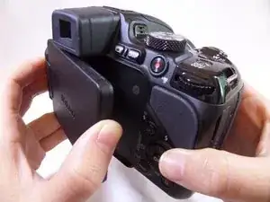 Обхватите камеру руками. Держитесь за диск режимов и за захват под кнопкой спуска затвора.