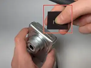 Откройте крышку отсека батарейки и карт памяти снова.