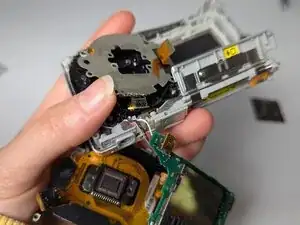 Действуя с осторожностью и небольшим усилием, разделите камеру на три части: основной корпус с объективом, плату с экраном и деталь вспышки (на втором изображении).