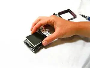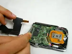 Экран потребуется держать слегка приподнятым над камерой, так как он по-прежнему будет соединён с камерой оранжевым ленточным кабелем.