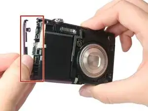 Снимите крепление шнурка и соответствующий боковой корпусный кожух с камеры.