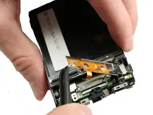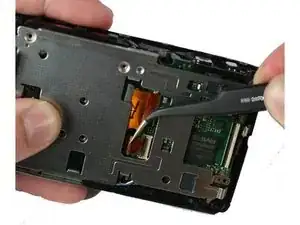 Используя пинцет для точных работ, аккуратно отсоедините ленточный кабель, идущий от ЖК-экрана к нижней стороне материнской платы.