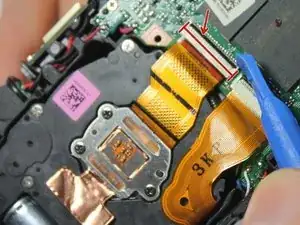 Чтобы отключить л Ribbon-кабель, используйте наконечник пластиковой лопатки или ноготь, чтобы поднять маленькую защитную крышку. Затем вы можете аккуратно извлечь л Ribbon-кабель.