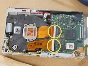 Освободите шлейфы объектива и ПЗС от ZIF-разъёмов, аккуратно подняв чёрную запорную планку на задней части разъёмов. Они могут быть немного тугими, поэтому требуется осторожность.