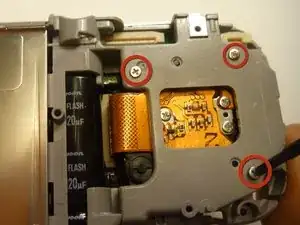 Крестовой отверткой #00 удалите три винта, закрепляющие край задней панели камеры.