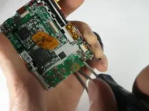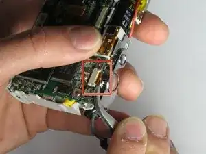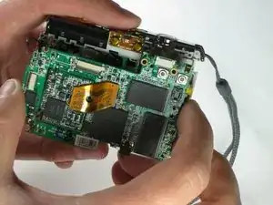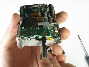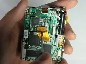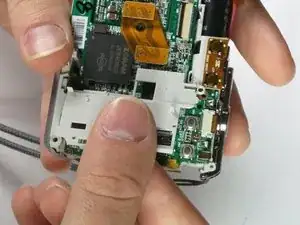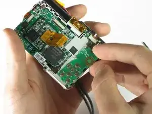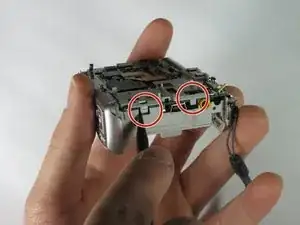 Используйте пинцет, чтобы снять ленточный кабель рядом с кнопкой спуска затвора.