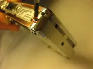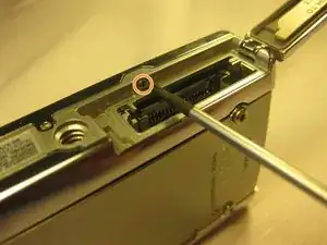 Открутите единственный боковой винт, расположенный на стороне камеры, где находится фиксатор, с помощью отвёртки #00.