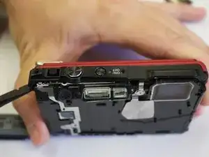 Используя пластиковый инструмент для вскрытия, подденьте чёрный компонент и выньте его из корпуса камеры.