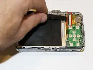 Используйте лопатку, чтобы разблокировать шлейфы экрана от платы. Осторожно поднимите черную скобу, чтобы освободить шлейфы.
