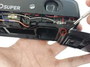 Используйте отвёртку с тонким стержнем и отверните два отмеченных винта внутри отсека плёнки.