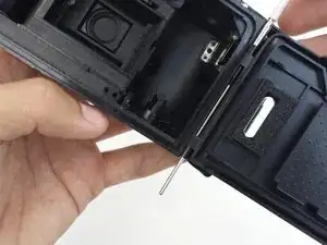 Используйте тонкий предмет, например зубочистку или маленькую отвёртку, чтобы надавить на металлический штифт, удерживающий дверцу отсека плёнки.