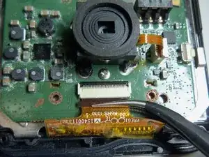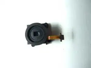 Показывается, как заменить объектив с помощью фотографий и текста. Объектив расположен на плате и требует пинцета для отключения шлейфов и извлечения платы из задней крышки.