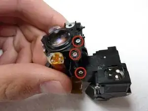 Удалите три показанных винта, чтобы отделить объектив от видоискателя.