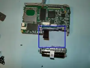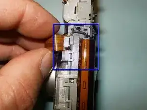 После удаления четырёх винтов становится легко получить доступ к разъёму ЖК-дисплея. Переместите белую защёлку в направлении, противоположном шлейфу, чтобы открыть разъём.