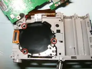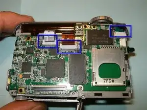 Отключите три шлейфа. Слева направо шлейфы отвечают за конденсатор вспышки, объектив и верхние кнопки управления.