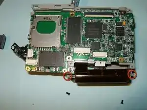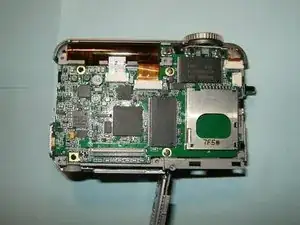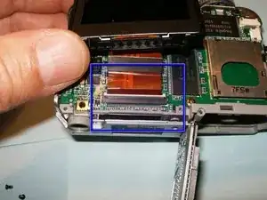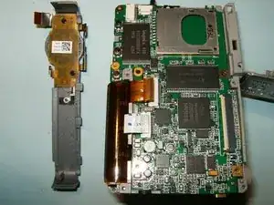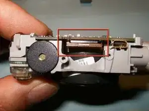 Плата логики всё ещё соединена с камерой кабелями питания. Не пытайтесь вынуть плату. Вместо этого отогните её в сторону. Если плату нужно заменить, два провода следует отпаять.