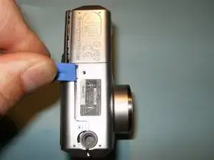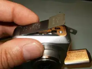 Откройте отсек в нижней части камеры. Извлеките батарейки и карту памяти.