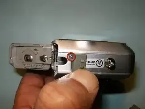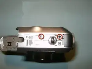 Поверните камеру на бок и выкрутите винт под крышкой разъёма USB.