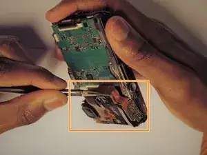 После этого используйте пинцет, чтобы отключить разъем с плоской верхней частью для платы объектива от материнской платы.