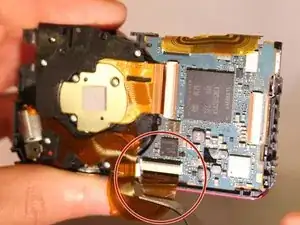 Чтобы отделить материнскую плату от объектива, необходимо вытащить два шлейфа из их разъемов с помощью пин