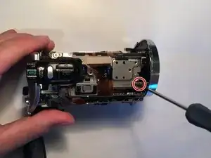 Удалите винт Phillips #00 длиной 3 мм с нижней части камеры рядом с корпусом объектива.