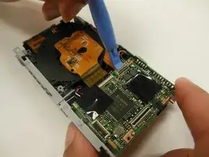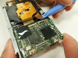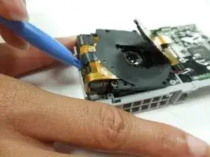 К оптическому блоку подключена небольшая лента, идущая к материнской плате. С помощью пластиковой отвёртки аккуратно поднимите фиксатор этой ленты, чтобы отсоединить её от материнской платы.