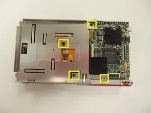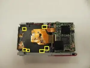 С помощью крестовой отвёртки №00 найдите и снимите четыре винта длиной 3,25 мм, которые крепят заднюю крышку к каркасу камеры.