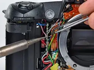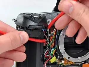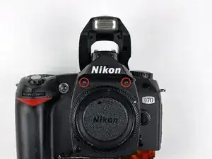 Удалите следующие два винта, крепящие верхнюю крышку к D70 рядом с кнопкой спуска: