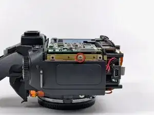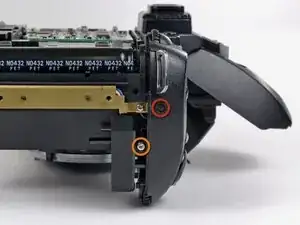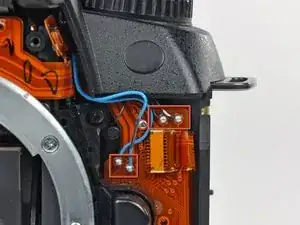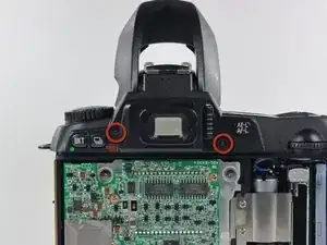 Удалите два винта Phillips 7,3 мм, крепящие верхнюю панель к D70 рядом с окуляром.