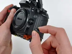 Удалите винт с крестообразным шлицем, крепящий верхнюю крышку к D70 рядом с диском режимов.