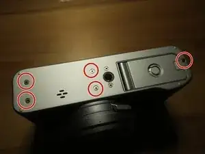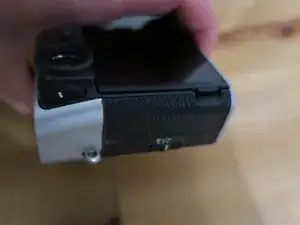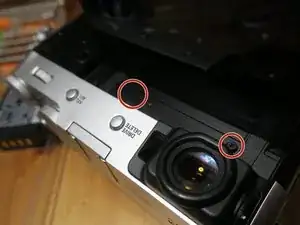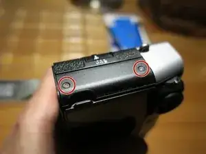 Отклейте кожзаменитель с левой задней стороны, около ЖК-экрана и видоискателя. Откроются два винта.