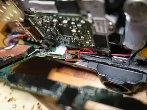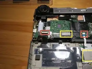 Отсоедините белый ленточный кабель. Перед извлечением оранжевого кабеля разблокируйте засов на разъёме. См. красные метки.