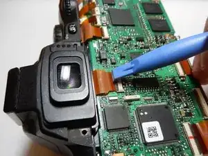 Выкрутите два видимых винта Philips #0 длиной 6,0 мм, расположенных с левой и правой сторон видоискателя. Эти винты выделены красным цветом.