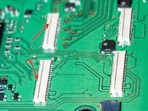 У этих разъёмов сзади есть защёлка с откидным фиксатором. Заднюю часть разъёма можно откинуть вверх с помощью лопатки или инструмента для вскрытия, чтобы кабели отключились с малой силой. После снятия кабелей положите заднюю крышку лицевой стороной вниз, чтобы не допустить попадания пыли.