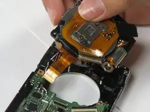 Отключите два ленточных кабеля от блока объектива, приподнимая защёлки ленточных разъемов лопаткой.