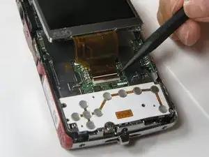 Осторожно приподнимите левую сторону ЖК-экрана и медленно сдвиньте его влево к корпусу камеры, но не снимайте полностью — там находится ленточный разъем.