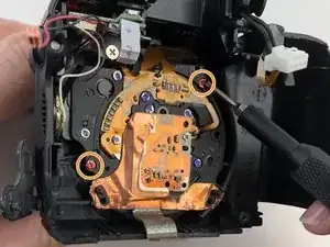 Удалите два красных винта Phillips #000 длиной 0.4мм с задней стороны отсека объектива.