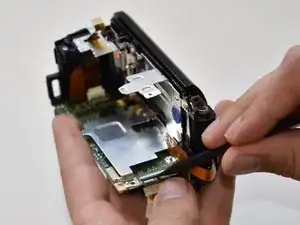 Гибкий кабель также продет вокруг части корпуса под материнской платой. Освободите этот кабель пинцетом, сдвинув вниз, а затем вытянув наружу.