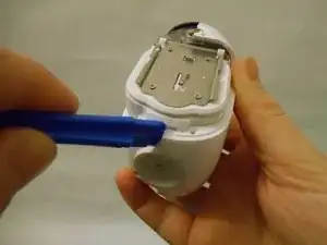 Снимите нижнюю часть корпуса над отсеком для батарей, подставив пластиковый инструмент для вскрытия под кромку корпуса и поддев её вверх.
