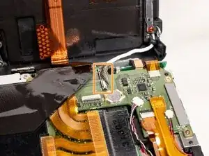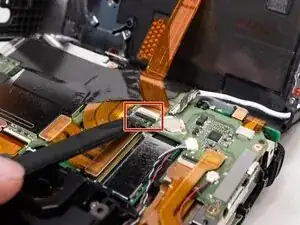 С помощью пластиковой лопатки аккуратно отожмите другой кабель, соединяющий заднюю крышку с камерой.