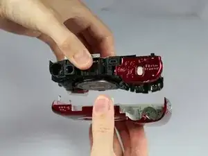 Крепко возьмите черный внутренний корпус сверху и снизу внутренней камеры. Другой рукой держите передний красный корпус.