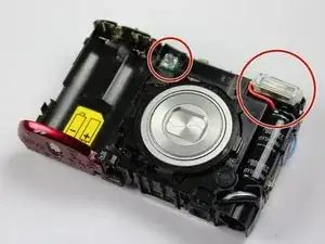 Используя отвертку Phillips #000, выкрутите два винта длиной 2 мм рядом с отсеком для батарей на правой стороне камеры.