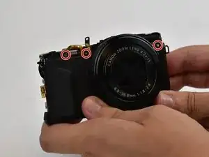 Используя Phillips #000, выверните один 3-мм и один 4-мм винт на правой боковой поверхности камеры, а также один винт под крышкой USB/HDMI.